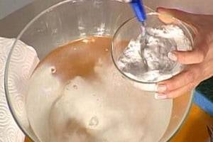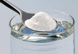 В пяти литрах разогретой примерно до 38-42 градусов воды тщательно растворяют до исчезновения частиц столовую ложку гидрокарбоната натрия.