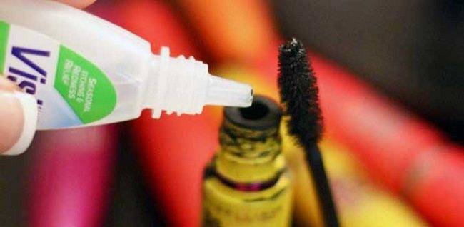 Этот метод можно считать гипоаллергенным, так как капли для глаз изначально не могут навредить органам зрения. Добавьте в тюбик 2-3 капли Визина, Альбуцида или других аналогов средства. Лучше оставить косметику на ночь, за это время процесс растворения завершиться.