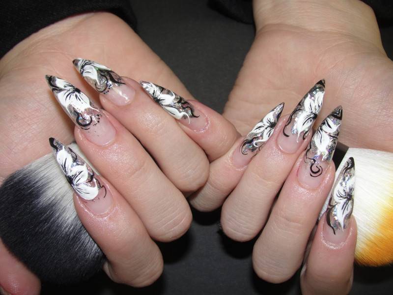 Такой вариант нейл-арта в черно-белом цвете принято выполнять на длинных наращенных ногтях. Да и сам дизайн создается при помощи акриловых материалов. Однако это вовсе не значит, что эта идея не может быть использована и на натуральных ноготках. А рисунок можно нанести и при помощи лаков.