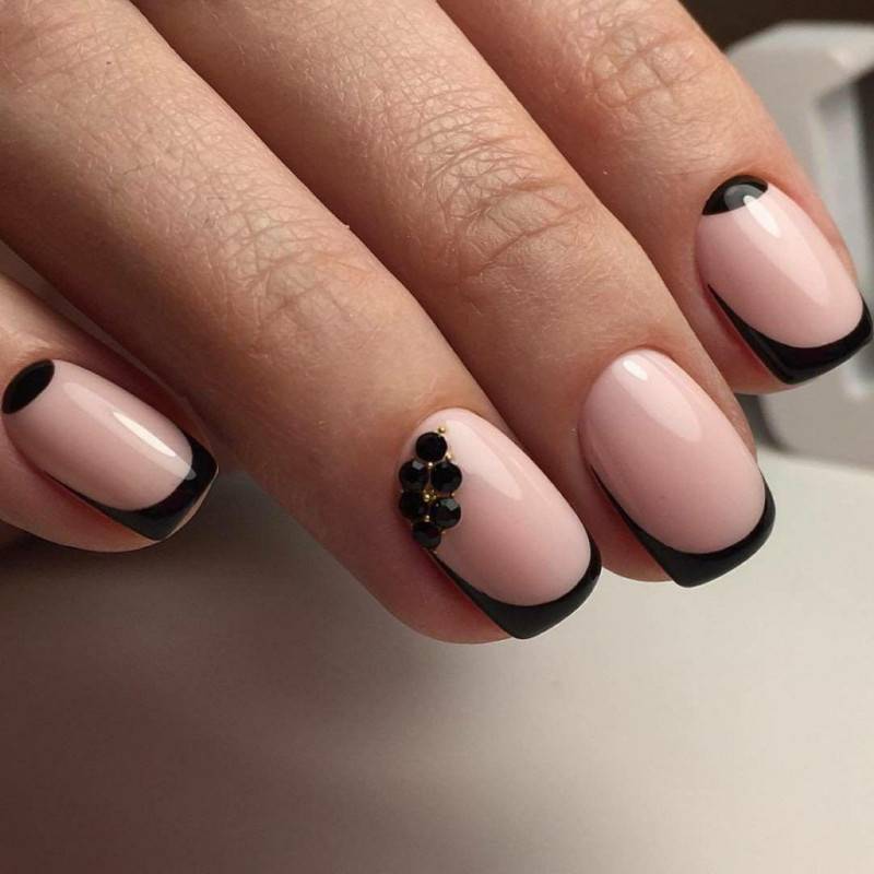Чёрный френч со стразами призван завершить шикарный образ. Дизайн будет удачным, если не переборщить с камнями. Здесь особенно важна мера. Для такого дизайна берут исключительно качественный материал, поскольку чёрный цвет способен обнажить любой изъян.