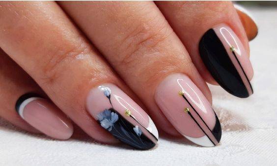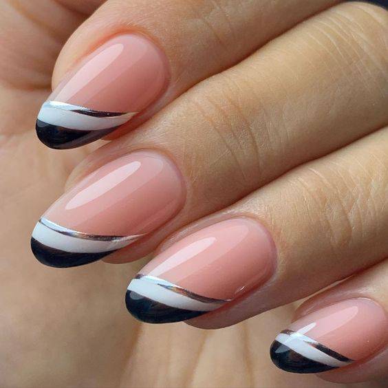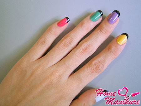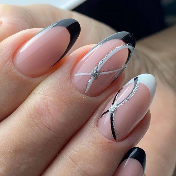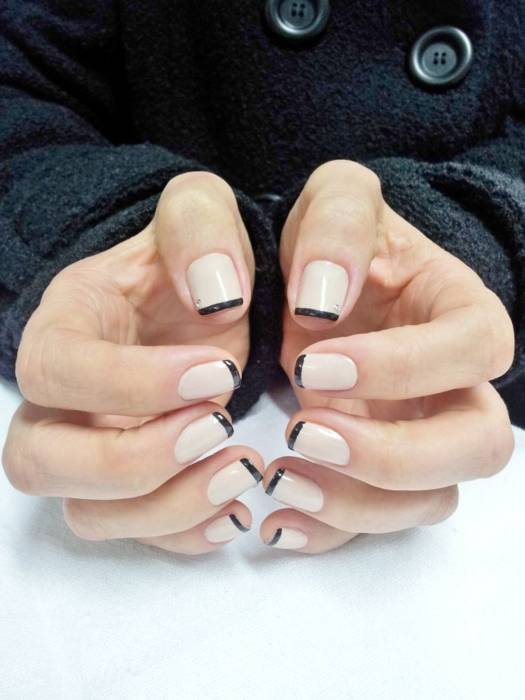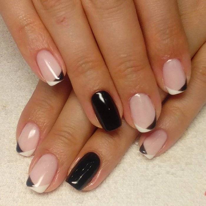 - Делаем классический френч, используя черный и белый лак через один ноготь.