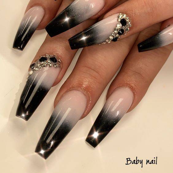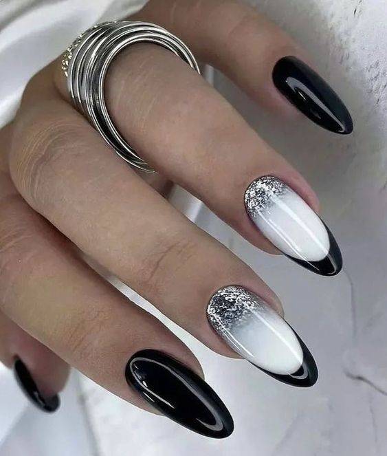 - Нежное омбре. Переход молочно-белого в насыщенно-черный цвет выглядит неимоверно эффектно и придает изюминку всему дизайну. Использовать его можно как отдельное решение, так и сочетая с прорисовкой или инкрустацией.