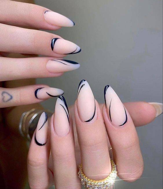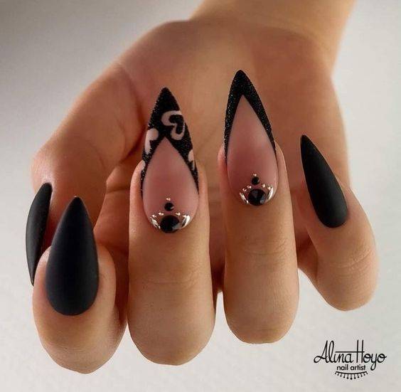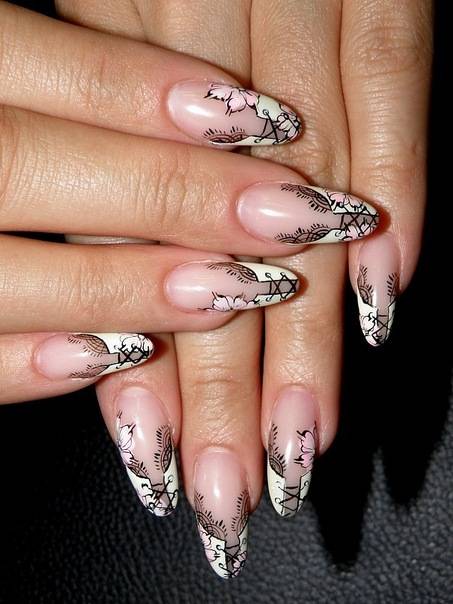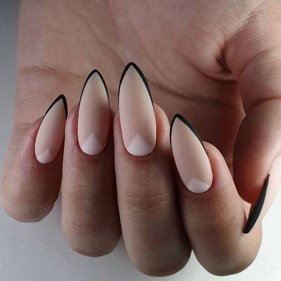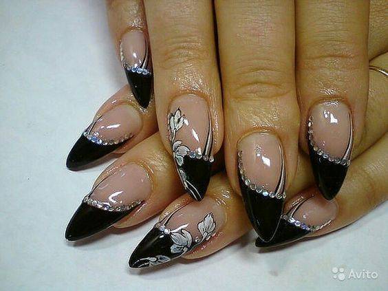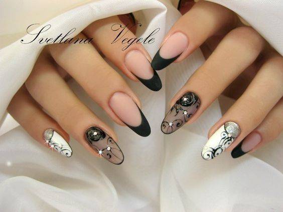 Не все дамы отдают предпочтение острой форме ногтей. Она считается не очень удобной и не особо практичной, но всё равно занимает лидирующие позиции в мире моды. У заострённых ноготков есть свои поклонницы, которые восхищаются своими ноготками и придумывают им необыкновенный дизайн. Для того, чтобы подчеркнуть и выделить данную форму, мастера салонов предлагают использовать чёрно – белый френч. Очень экстравагантно смотрятся такие ноготки с белой полоской ниже середины пластины. Также отличным вариантом считают тоненькие белые улыбочки на самом краю или широкая улыбка почти до середины ногтя, выполненная в форме дуги. Ажурные росписи, различные элементы декора в ненавязчивом нанесении, умело подчеркнут изюминку вашего маникюра.