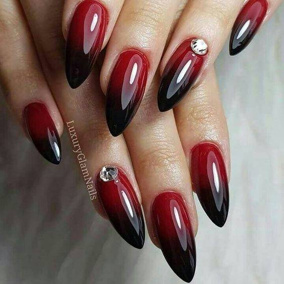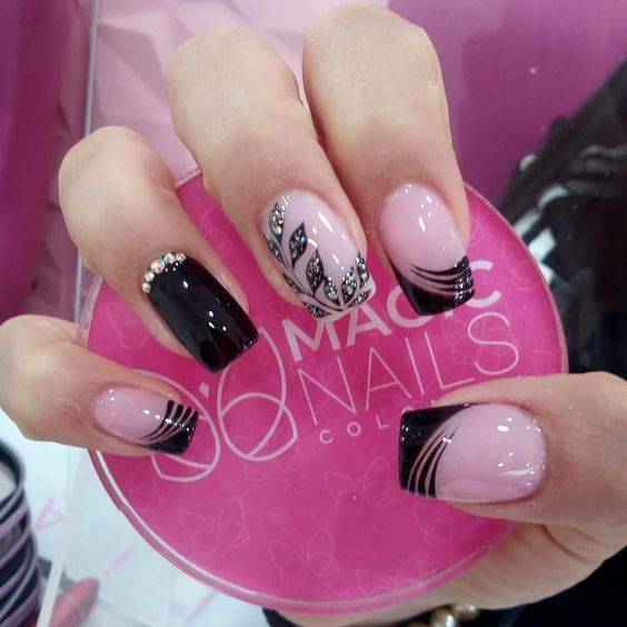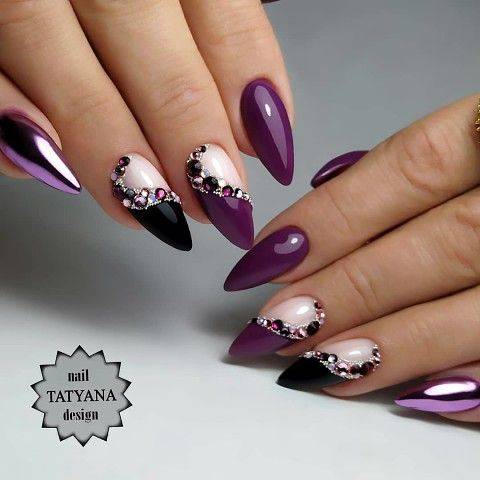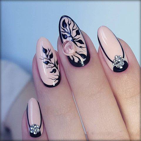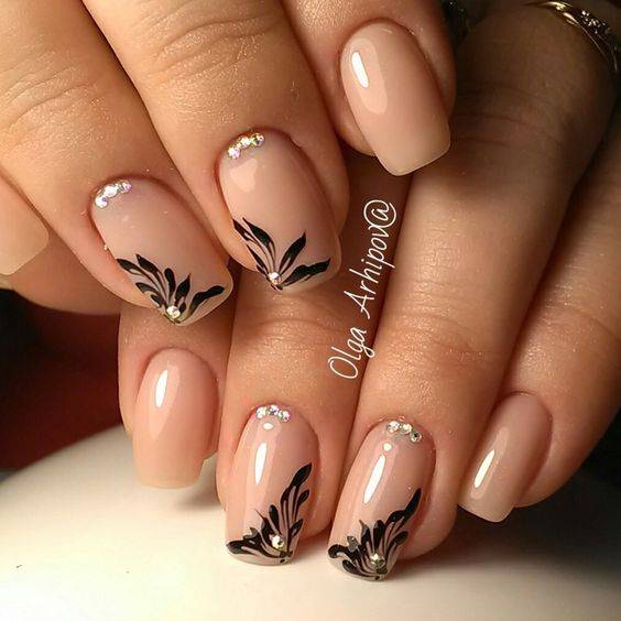Россыпи сияющих камней просто притягивают внимание к вашим ноготкам! Попробуйте использовать в маникюре стразы чёрного цвета, и они поразят вас своим магическим и завораживающим блеском. Украсьте основание ногтя или линию улыбки, и останетесь довольны результатом
