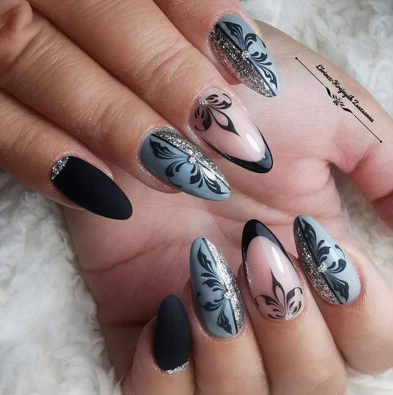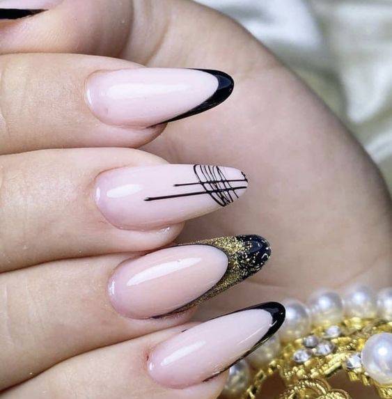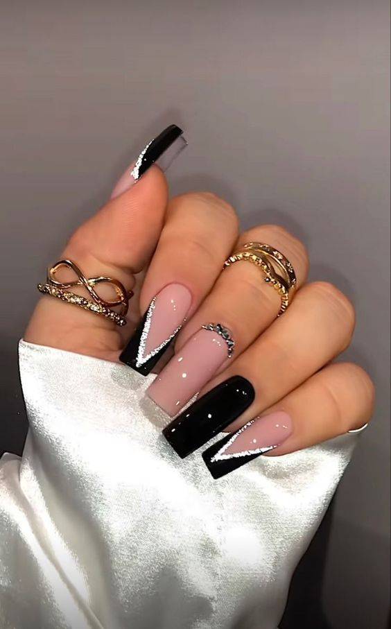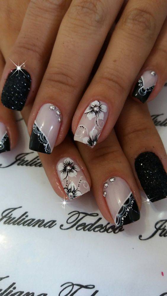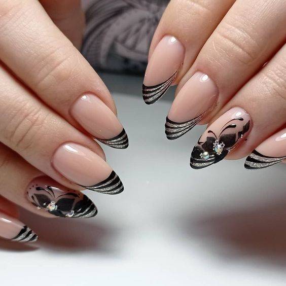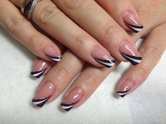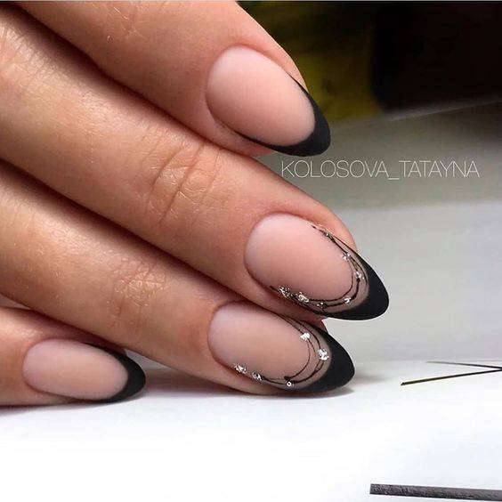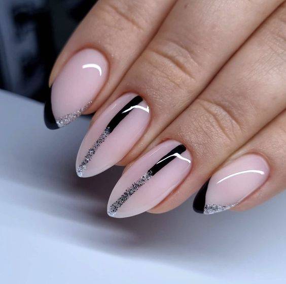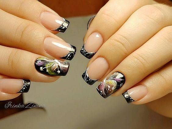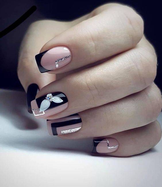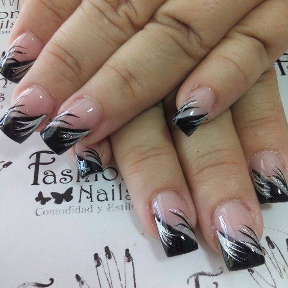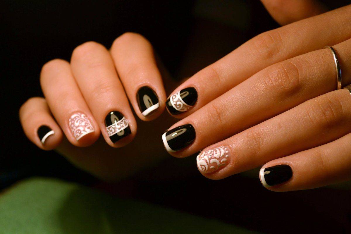 Хотите удивить окружающих необычайной легкостью и воздушностью нейл-арта? Декорируйте ногти черным кружевом. Проще всего это сделать с помощью стемпинга для ногтей, но при желании вы сможете воспользоваться обычным лаком, нанеся витиеватые узоры тонкой кисточкой. Эффектно смотрится черный френч, украшенный золотистыми и серебристыми полосками глиттера. Блестки можно использовать сухие, или же наносите их на ногти вместе с глиттерным лаком. Любительницам броского и яркого нейл-арта подойдет разноцветный дизайн с черными кончиками. Предлагаем вашему вниманию несколько фото идей для создания роскошного маникюра.