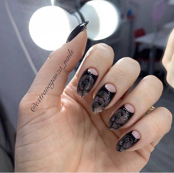 Чёрный френч буквально создан для рисунка, идей которого существует множество: тонкое кружево или паутинка, сдержанная графика или тату. Кто-то выберет геометрию или вуаль, все они превосходно смотрятся на чёрном.