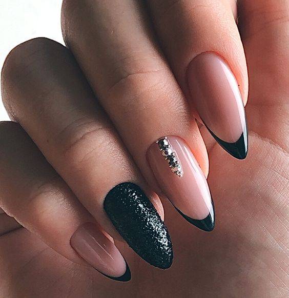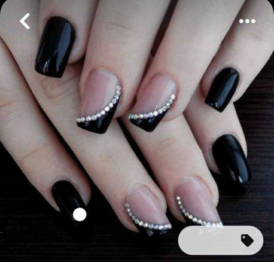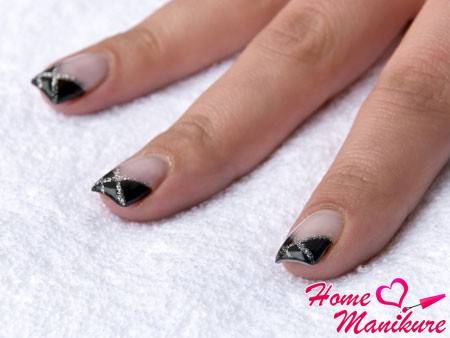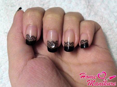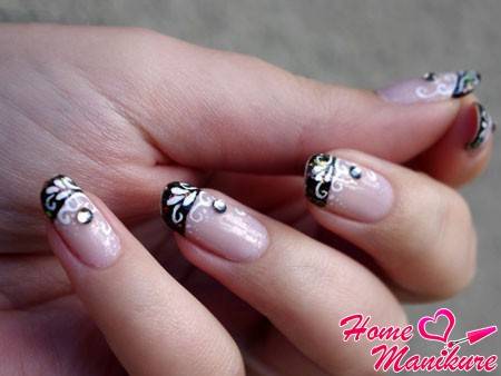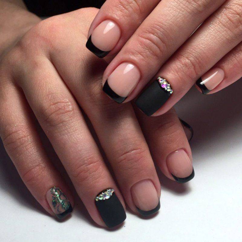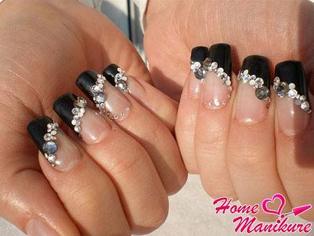 Чёрный френч со стразами призван завершить шикарный образ. Дизайн будет удачным, если не переборщить с камнями. Здесь особенно важна мера. Для такого дизайна берут исключительно качественный материал, поскольку чёрный цвет способен обнажить любой изъян.