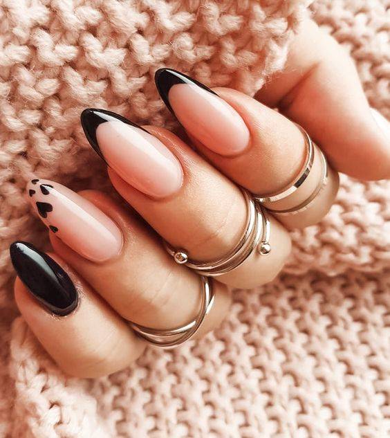 Чёрный френч с лунным маникюром становится всё более популярным. В тренде — контраст, где чёрный превалирует. Лунку можно выполнить в светлых тонах. Техника больше подходит для длинных ногтей, поскольку визуально она укорачивает ногтевую пластину.