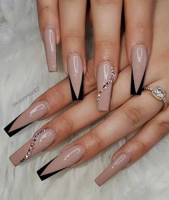 Сделайте френч в геометрической манере исполнения и украсьте контуры покрытия противоположными по цвету стразами. Просто великолепно!