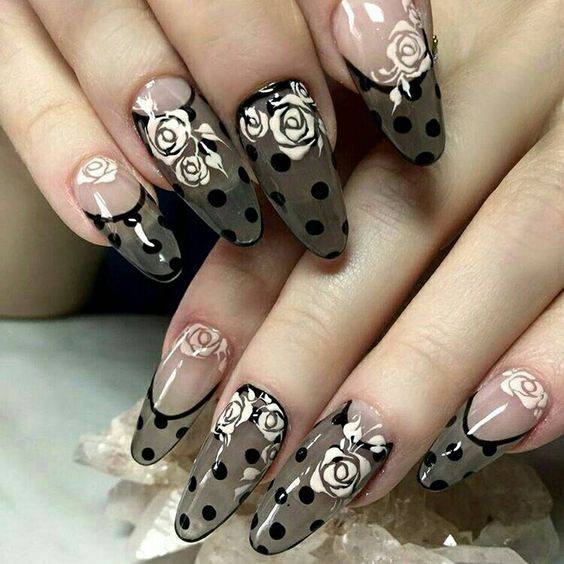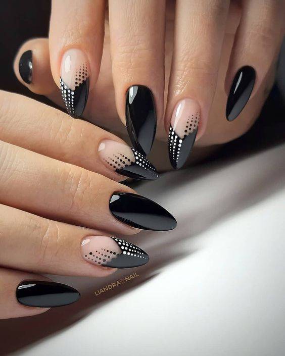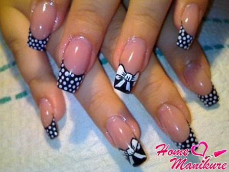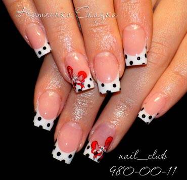 Контрастирующий черно-белый цвет олицетворяет собой две противоположности Инь и Янь, которые сплетаются в гармоничную композицию. Для создания применяются различные техники. Так, например, с помощью дотса можно украсить френч обворожительным горошком. Черно-белые точки наносятся отдельно или сочетаются в различные узоры.
