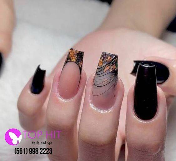 - Здесь же можно применить золотые блёстки, которые будут смешиваться с чёрным гель лаком и создавать эффект «мерцания» на ногте.