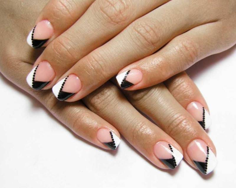 Пожалуй, это один из самых модных и часто используемых вариантов черно-белого френча на ногтях. Все потому, что смотрится он довольно эффектно. А помимо этого, подойдет этот черно-белый френч и для коротких ногтей! Итак, можно начинать делать работу так же, как и в классическом варианте французского маникюра. После того как ваша работа просохнет, нанесите геометрические узоры черным на белую полоску френча. Чаще всего наносят треугольники, две или три тоненькие полосы, а то и рисуют целые лабиринты.