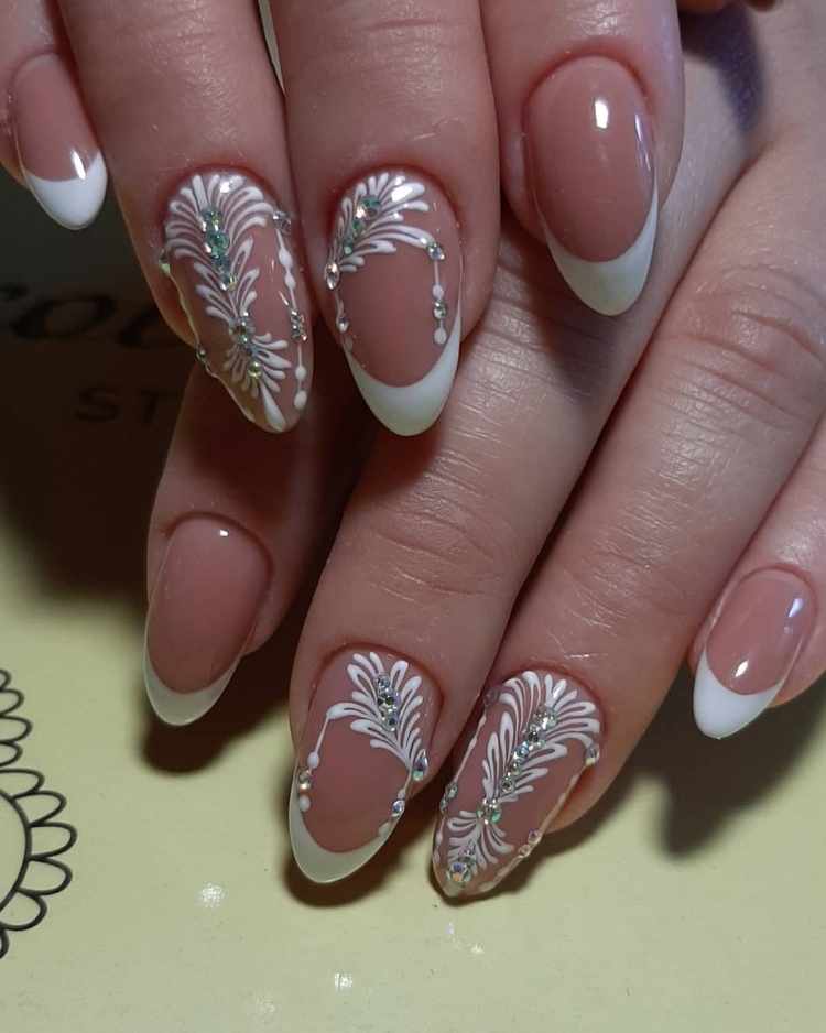 - Острый френч цвета какао с блёстками и омбре к белому цвету. Рисунки стразами располагаются в середине одного из ногтей или у основания лунного маникюра.