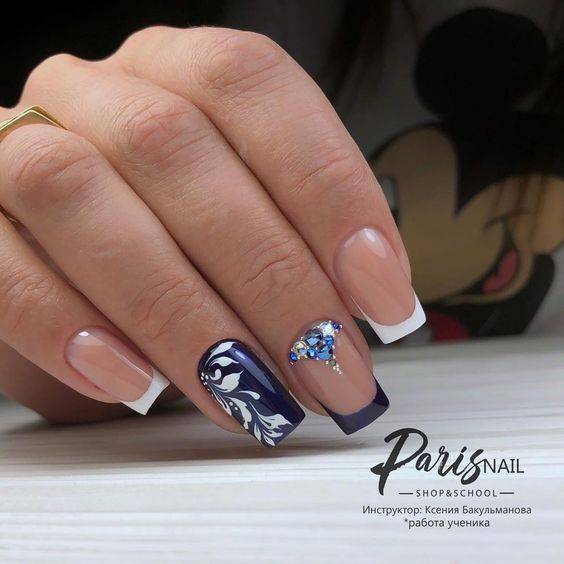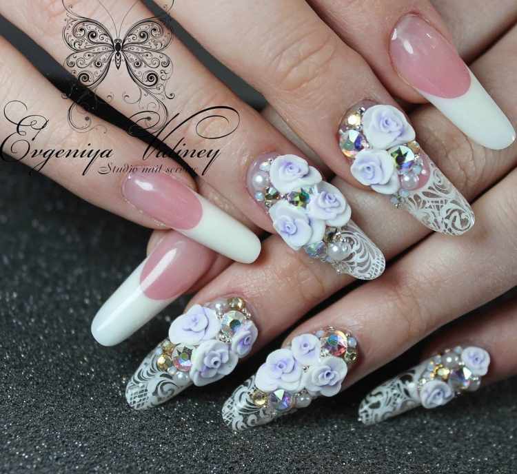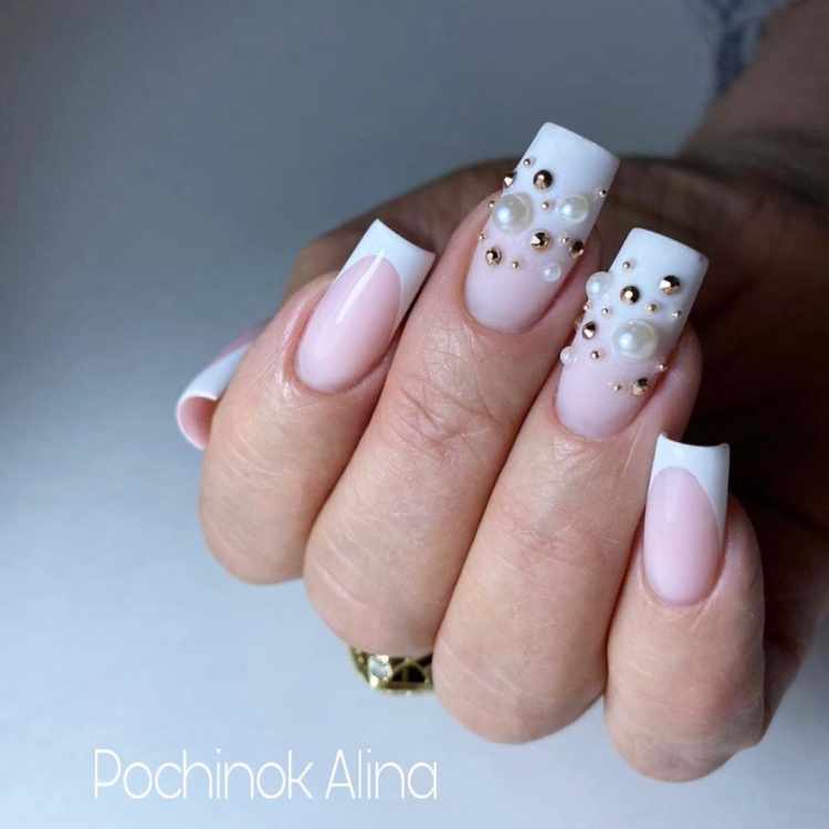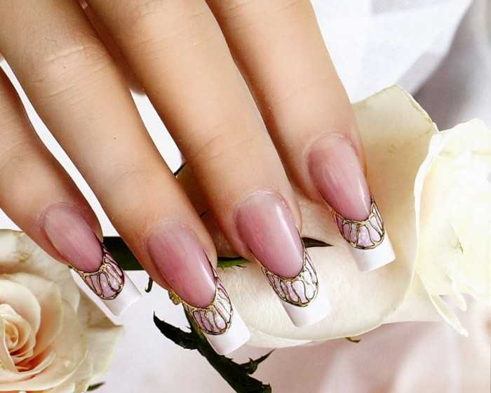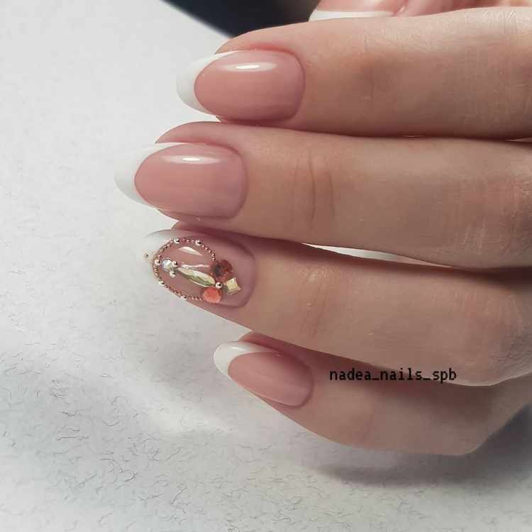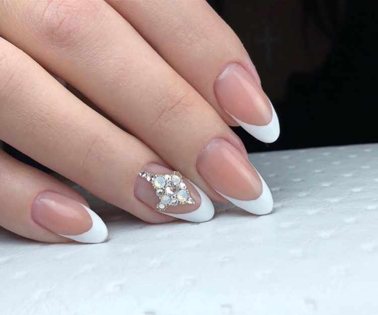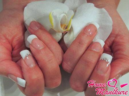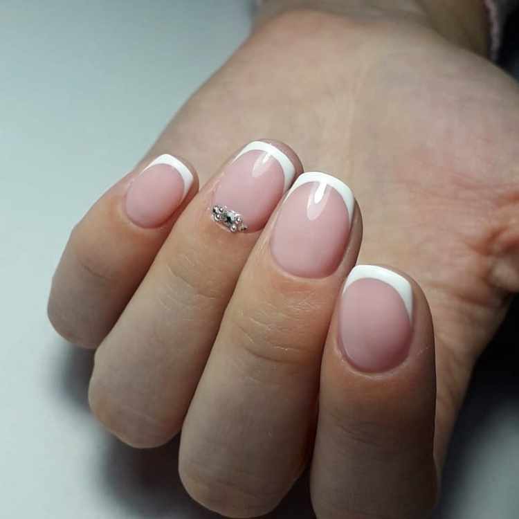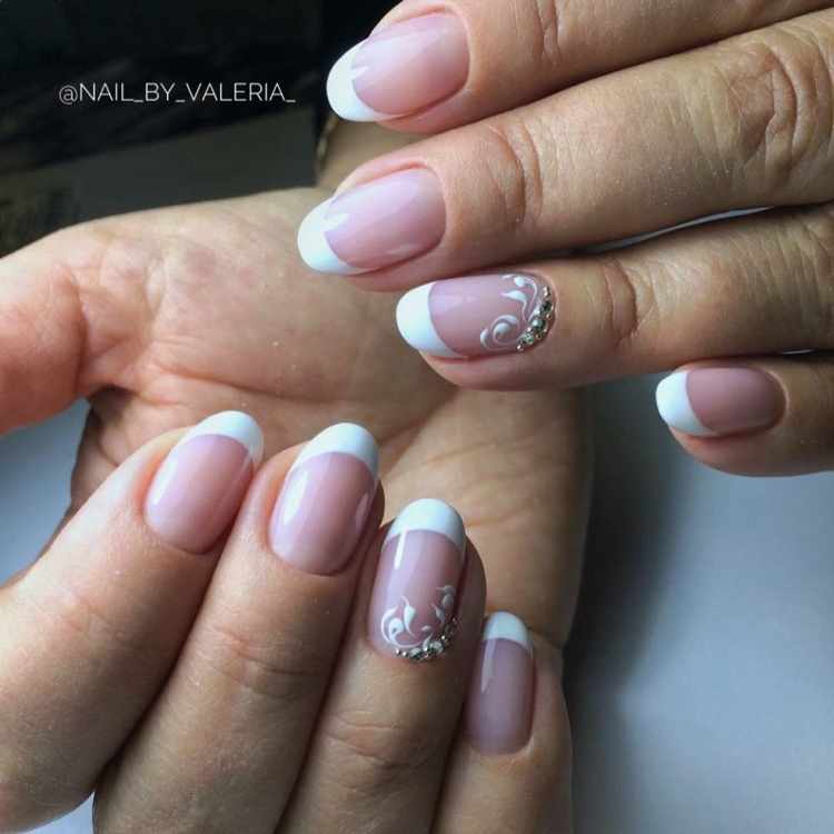Белый способ оформления остаётся актуальным во все времена, поскольку он является базой, основой всех основ. Благодаря этому шаблону многие специалисты начали экспериментировать с основой, добавлять во французский стиль кристаллы и другие элементы декора.