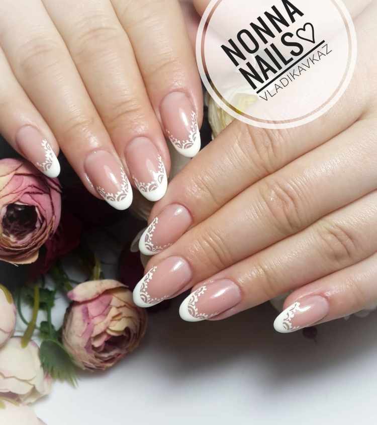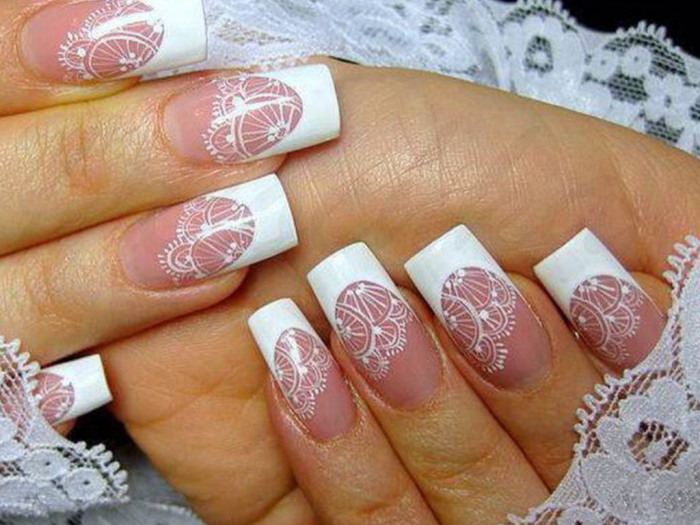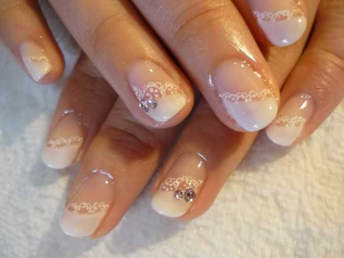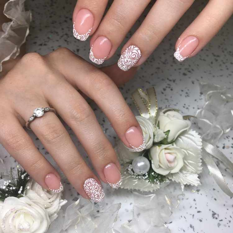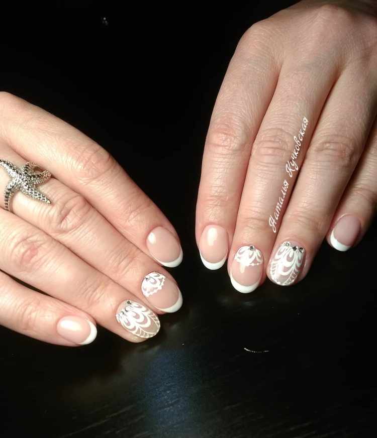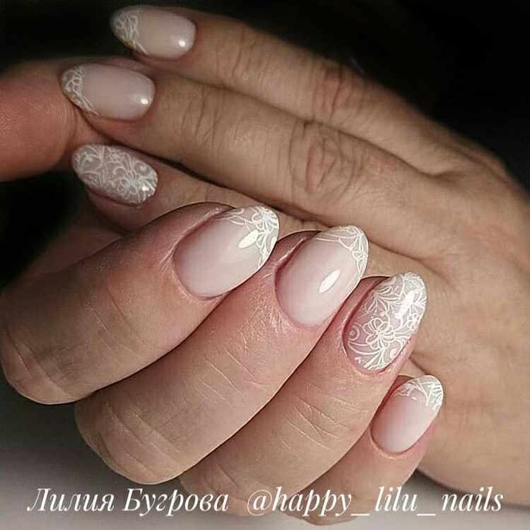 Самая гармоничная комбинация, которую можно придумать, это френч с кружевом. Французский маникюр идеально вписывается в свадебный образ, пальчики невесты становятся аккуратными и нежными.