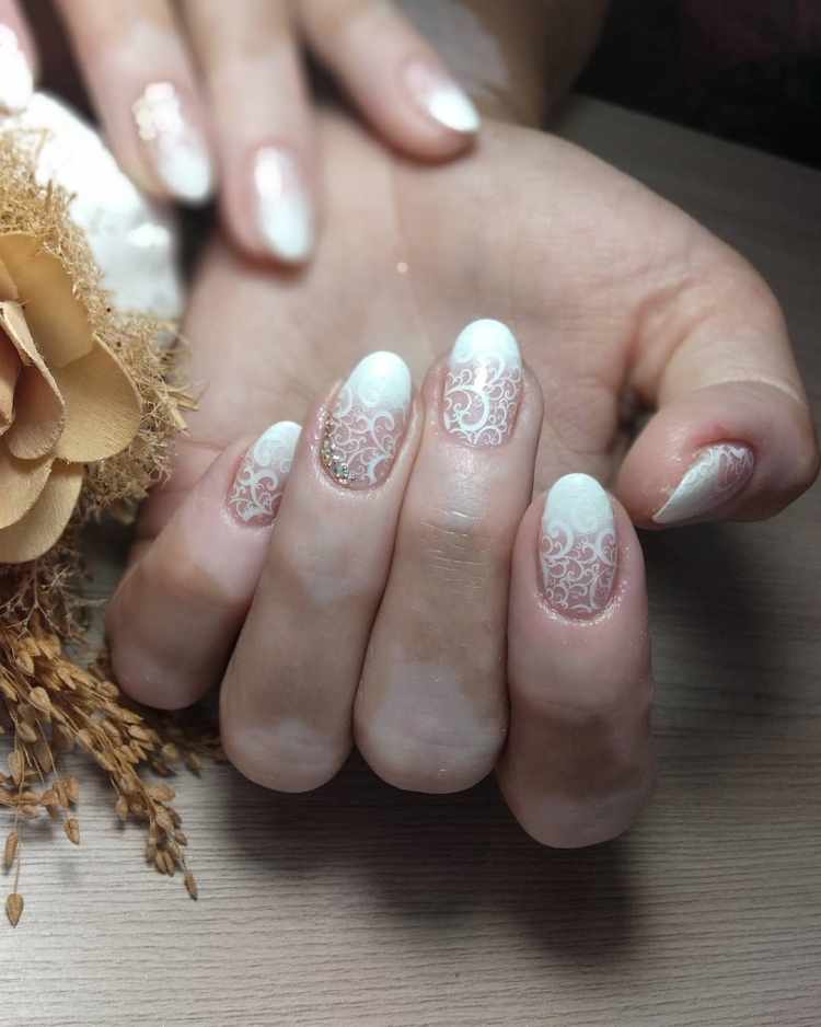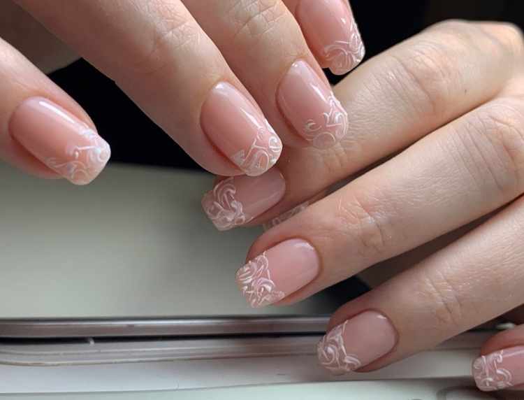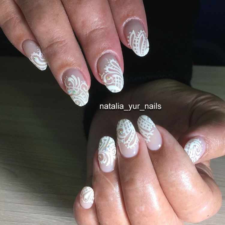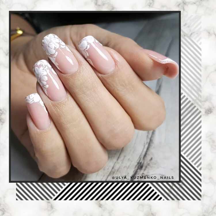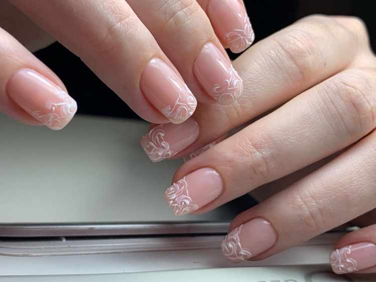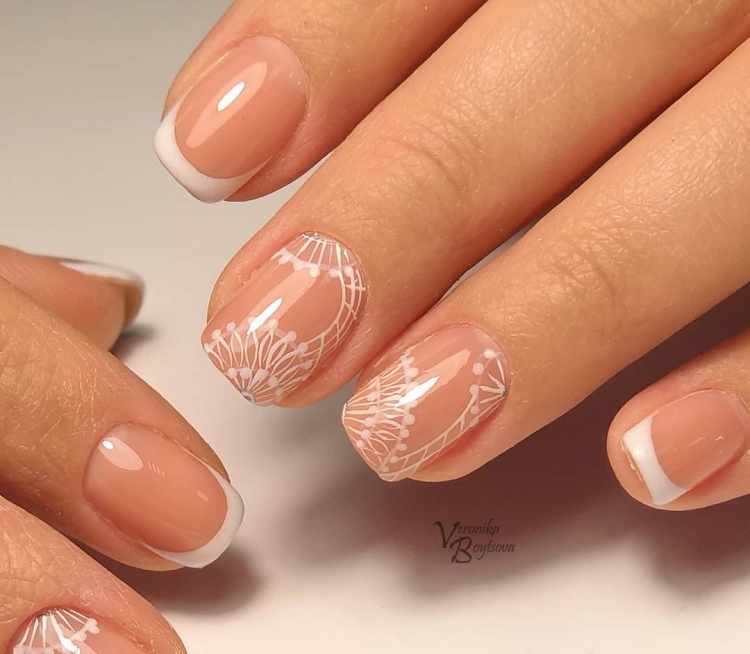 Самая гармоничная комбинация, которую можно придумать, это френч с кружевом. Французский маникюр идеально вписывается в свадебный образ, пальчики невесты становятся аккуратными и нежными.