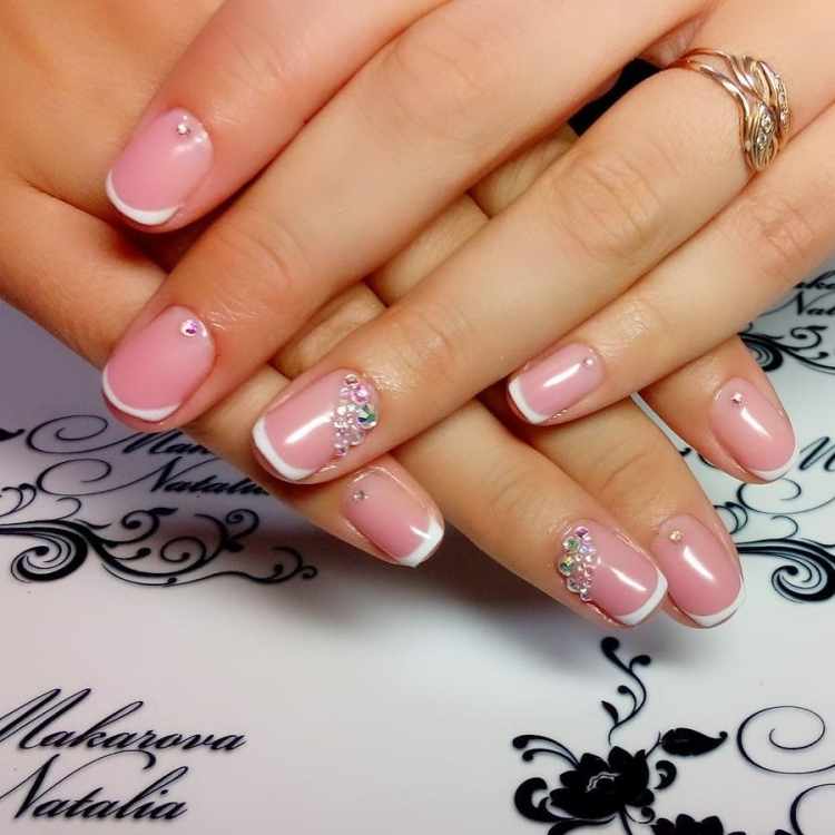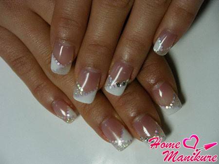 - Уже завершенный френч покрываем бесцветным лаком, к которому, без промедления, прикладываем стразы.