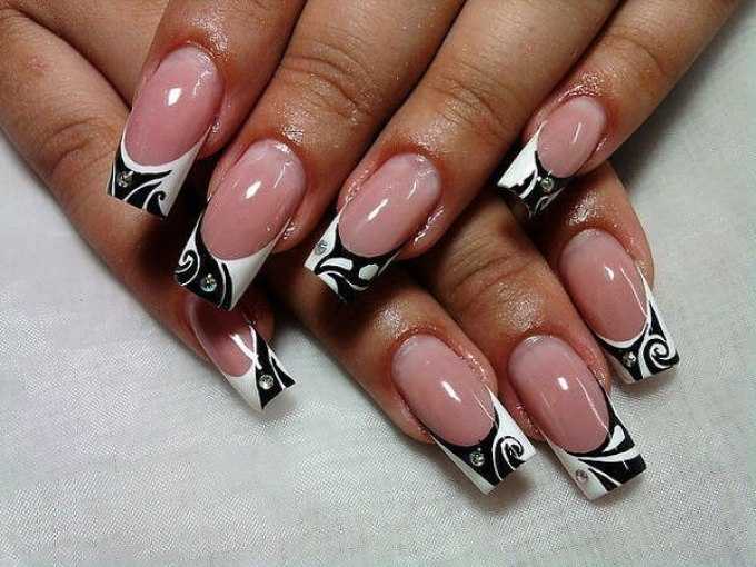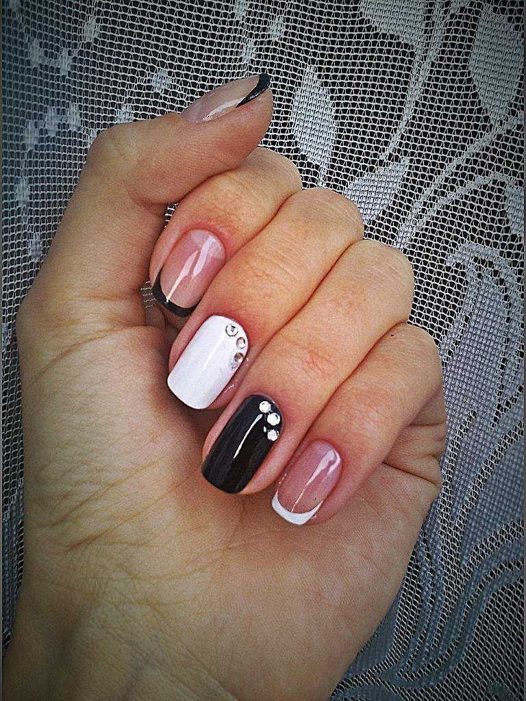 Обычный казалось бы маникюр в черно-белых тонах, но всего несколько страз делают его с некой долей шика и помпезности.