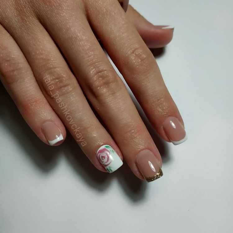 - Половинки цветов – розы, ромашки, магнолии. Располагаются у основания и края безямынного пальца. Выполняются акриловыми рисунками. Блестящими остаются кончики френча.
