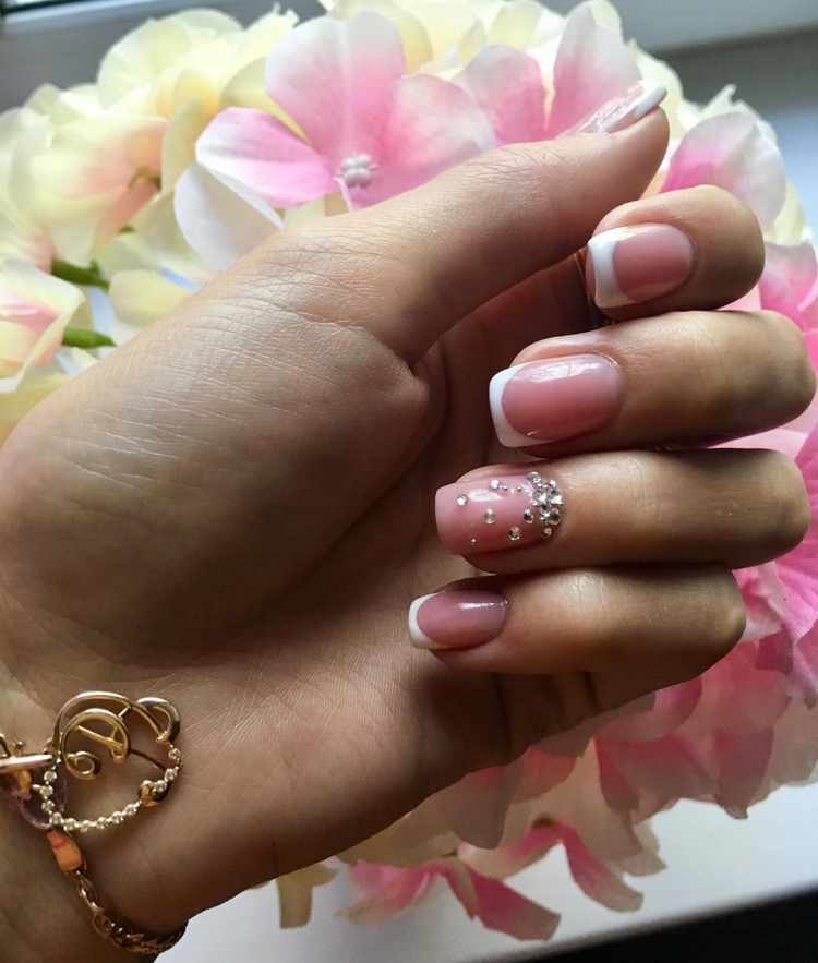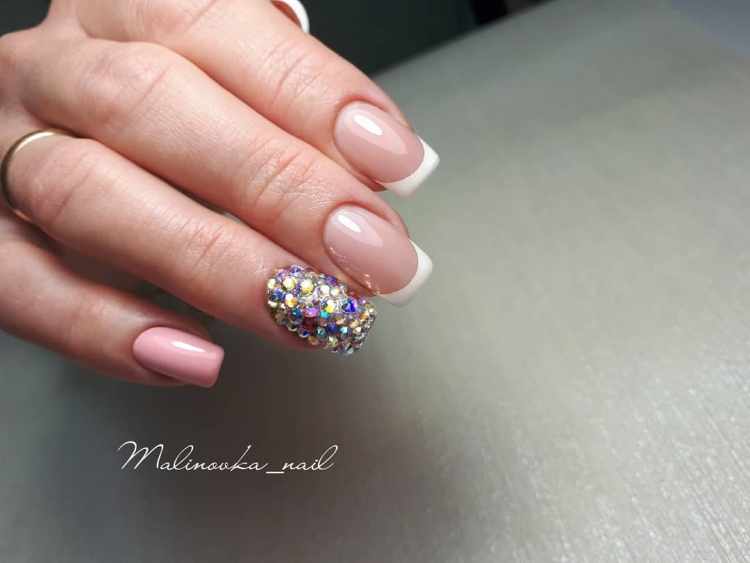 Классический френч со стразами бьет все рекорды по популярности, его обожают женщин разного сословия. Идеи с кристаллами чаще всего выбирают для торжественных мероприятий, свадеб и помолвок.