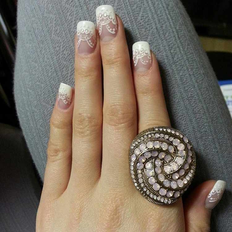 Оригинальный дизайн ногтей. Белый френч с ажурным рисунком на квадратные длинные ногти