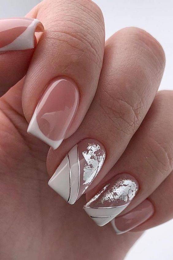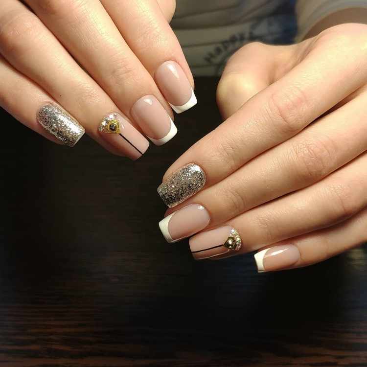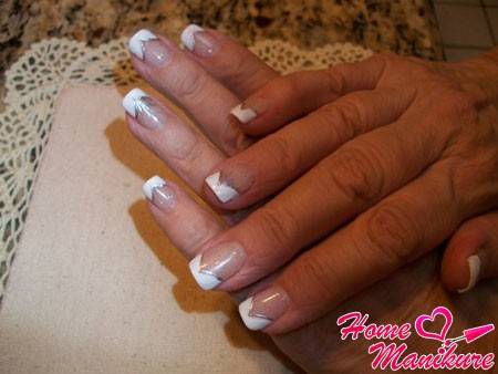 Трендом этого сезона можно назвать неотразимый французский маникюр с золотом, серебром. Его дамы делают на праздничные вечеринки и торжественные события. Как правило — белый френч применяют для украшения ногтей под белое платье. Очень хорошо такой дизайн ваших ногтей будет смотреться под свадебное платье.