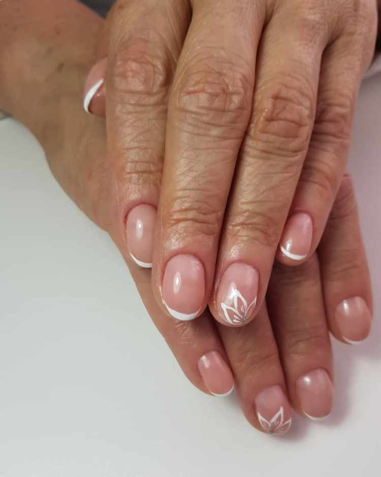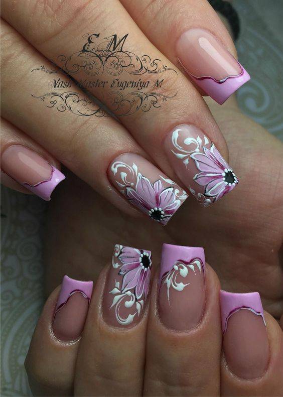 Цветочные мотивы – отличное дополнение к французскому маникюру. Они могут реализоваться в любой цветовой гамме. «Линию улыбки» можно оформить в виде элегантного намека, используя несложную, но остромодную технику «паутинки».