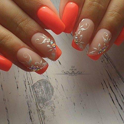 Во французском маникюре нет ограничений. Черный можно смело сочетать с оранжевым солнечным оттенком лака. Только обязательно продумайте как и с чем вы будете “носить” такой дизайн. Оранжевый — достаточно активный цвет для базы. И хотя он несколько уравновесится темным кончиком, все же останется доминирующим.