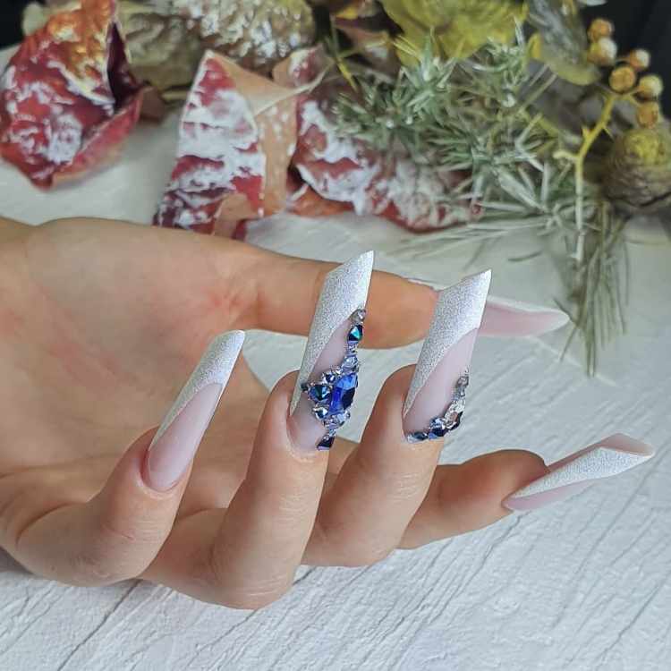 Голубой френч с блестками и стразами лучше всего смотрится на миндалевидных заостренных ноготках.