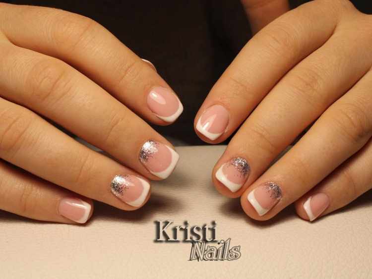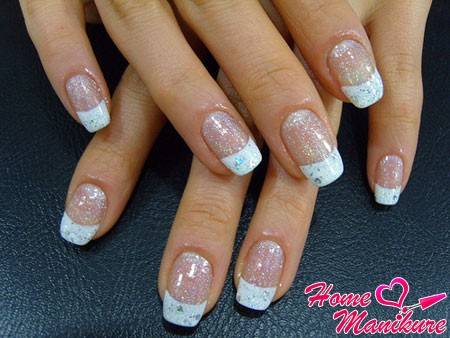 Сегодня особенно популярен классический французский маникюр, декорированный глиттером и стразами. Кроме того, дизайнеры предлагают немного видоизменять форму улыбки, рисуя ее не дугообразной, а треугольником или по диагонали. Для френча лучше оформлять квадратные кончики ногтей, которые покрываются белым лаком, после чего украшаются стилистическими элементами. Благодаря скромному декорированию классический французский маникюр будет уместен в любой обстановке. Предлагаем вам почерпнуть несколько сказочно красивых идей из коллекции фото.