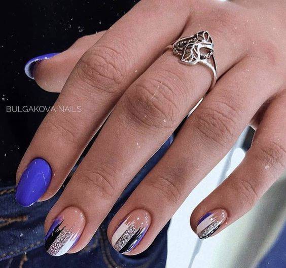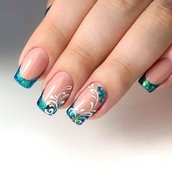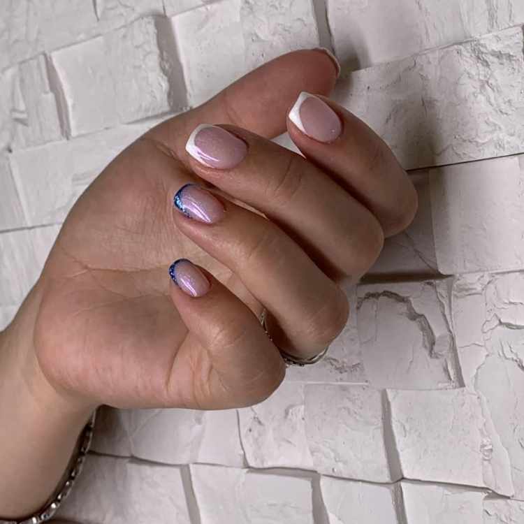 Летом используется сочетание синего выкладного френча с бежевой основой и рисунком ракушки или морской звезды у основания ногтя. Он создаёт летнее настроение и сочетается красиво с джинсовой одеждой. Кроме того, актуален акварельный маникюр френч с прозрачными синими блёстками, напоминающими воду. Такой маникюр всегда будет смотреться актуально, современно и смело.