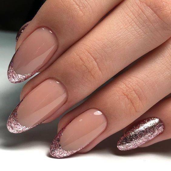 На сегодняшний день одним из лучших и самых популярных дизайнов является перевернутый френч. Такой маникюр выполняется в модной технике выделения зоны кутикулы гель лаком, что делает его очень модным и трендовым. В качестве потенциальных материалов для данного дизайна чаще всего используют сверкающий и сияющий декор, к примеру, глиттер, маникюрную фольгу или даже стразы.