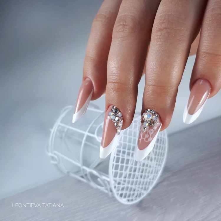 Существуют также варианты острой или миндалевидной формы. Чаще они используются для нестандартных вариантов френча, и довольно сильно отходят от оригинальной концепции. Такой вариант маникюра в качестве свадебного френча можно выполнить различной формы.