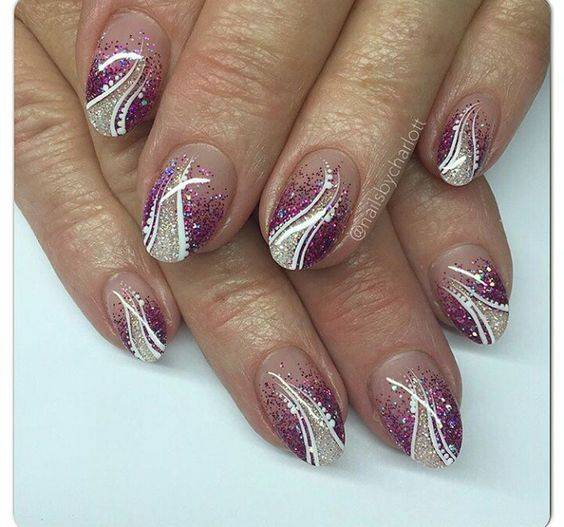 Блестящие элементы при таком варианте оформления можно использовать для оформления как полоски на кончике, так и для создания самого рисунка.