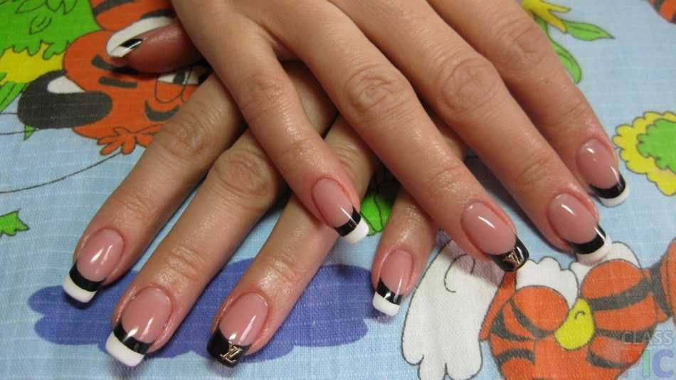 Классический французский маникюр с улыбочками черно-белого цвета со стразами логотипа Луи Витон дополнят образ модной, современной девушки.