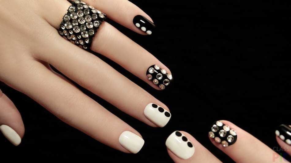 Камни, стразы и другой декор настолько приглянулись модницам, что уже который сезон остаются на пике популярности. В сочетании с черно-белым дизайном можно создать самые необычные варианты.