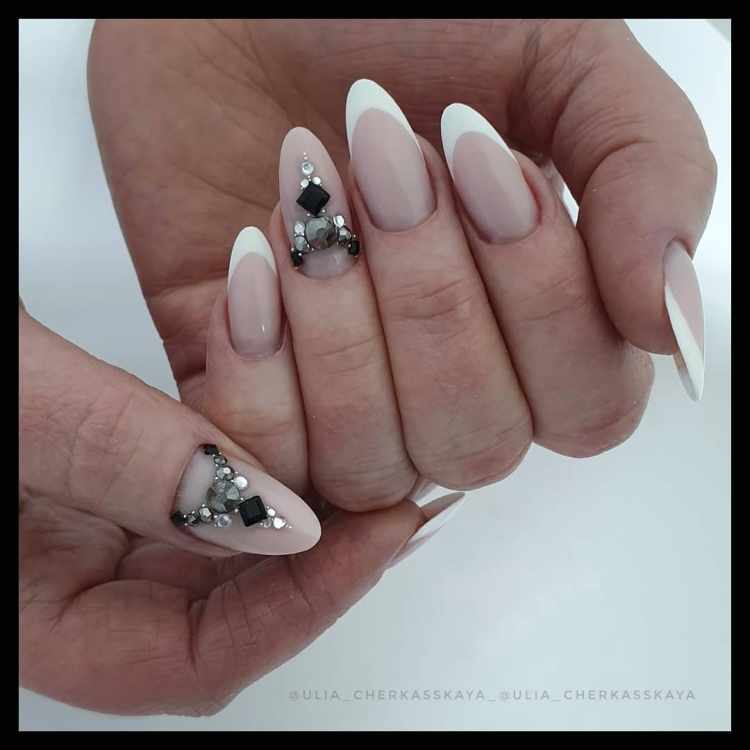 Варианты красивого черно-белого френча с камнями и стразами на короткие и длинные ногти