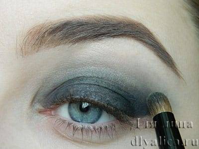 Всю тушёвку покрываем более тёмным серым оттенком. Нам необходимо добиться плавного перехода с чёрного цвета, на кожу. Так как макияж должен быть строго чёрным, то оттенки, в которые переходит чёрный при высветлении, будут все цвета серого. Тогда мы получим натуральный переход. Вместо серого мы можем использовать абсолютно любой цвет. Главное – создать подложку для чёрной дымки.