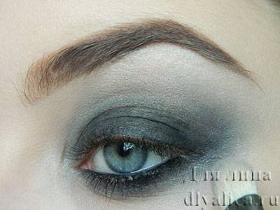 Теперь работаем только с тушёвкой карандаша и не заходим за её пределы внутрь века. Подберите два светло-серых оттенка теней. Самый светлый наносим в уголок и под бровь.