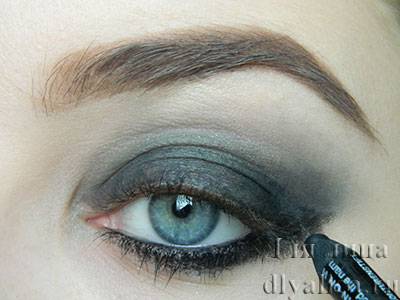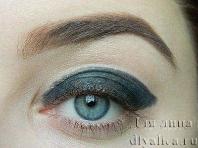 - Дорисовываем черным нашу стрелку, делая цвет максимально насыщенным на внешнем уголке глаза и осветляя его по мере окончания стрелки. Не обязательно должен получиться черный цвет – макияж черно белыми тенями для светловолосой девушки допускает темно-серую стрелку. Нижнее веко можно также подкрасить, но только с внешней стороны;