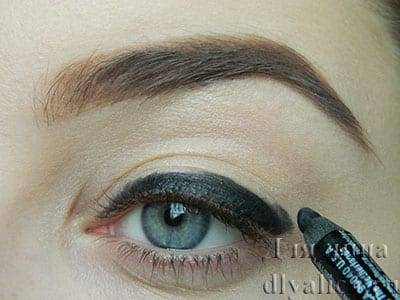 Для стойкости лучше всего взять водостойкий карандаш или кремовые тени в чёрном цвете, так как будет не очень красиво смотреться, если тени начнут скатываться в складках, а карандаш на слизистой. Карандаш будет служить подложкой, которая сделает макияж угольно-чёрным и очень насыщенным.