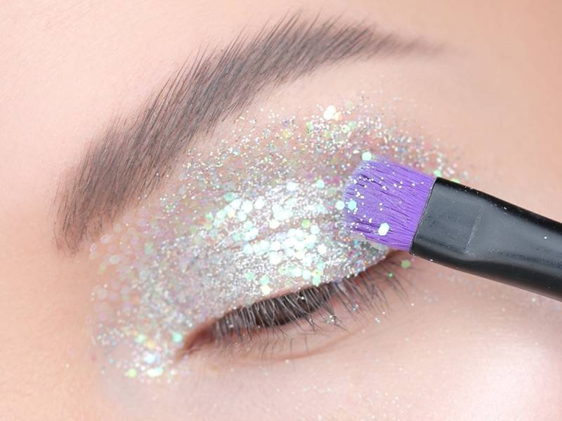 Белый глиттер используется для дневного и вечернего макияжа. Его наносят на веки, в уголки глаз, на стрелки, губы, различные участки лица сплошным слоем или точечно.
