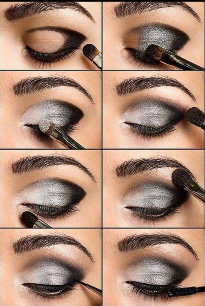 нужно перед началом покраски применить сорбитоловый крем. Далее придаем образу легкость: для этого наносим поверх темно-синий тон, матовый или с металлическим блеском. Помимо уже приведенных примеров правильного нанесения, не стоит забывать и об участке кожи, которая находится выше подвижного века. Её так же нужно закрасить, в этом случае черный будет выглядеть роскошно, а в визаже не будет проблескивать мрачность.