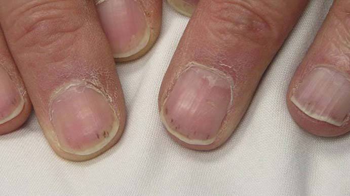 Может привести к нарушениям любого внутреннего органа. На состояние кожи и ногтей влияют противомалярийные препараты и антибиотики группы тетрациклинов. После окончания курса лечения, темные полоски и точки исчезают.
