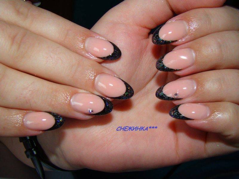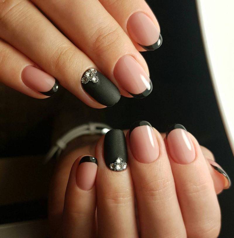 Черный френч на ногтях прекрасно сочетается со стразами. Главная заповедь такого маникюра – знать меру, ведь использование черных тонов в дизайне само по себе бросается в глаза.