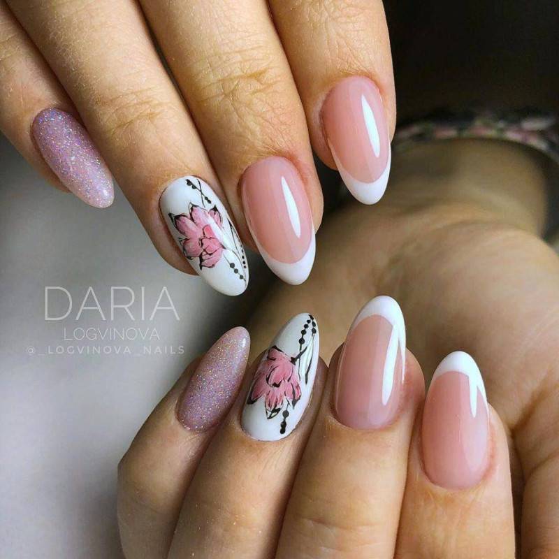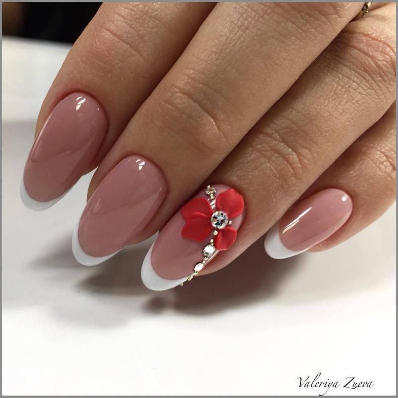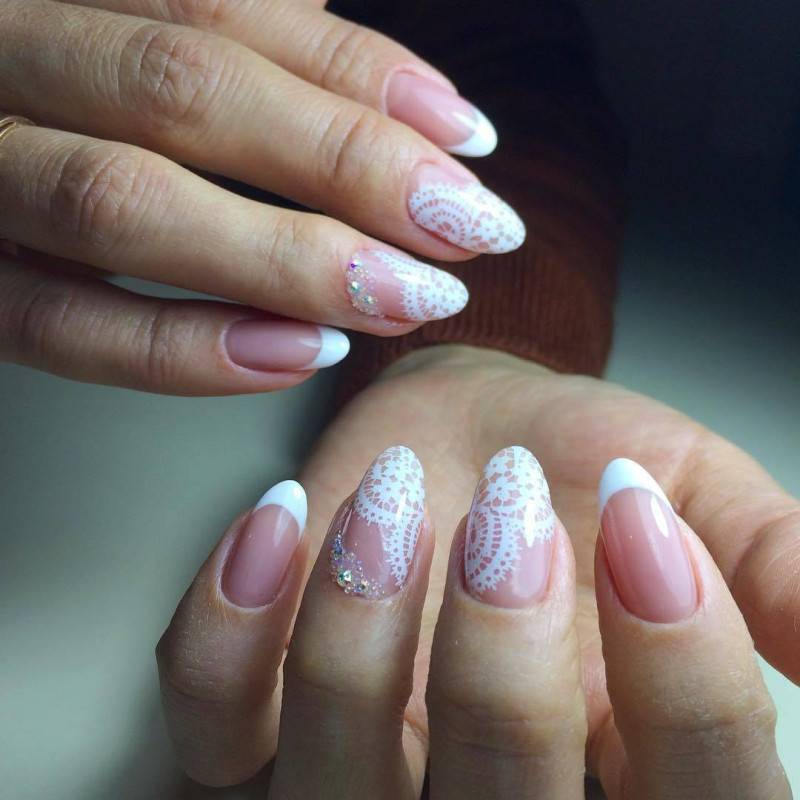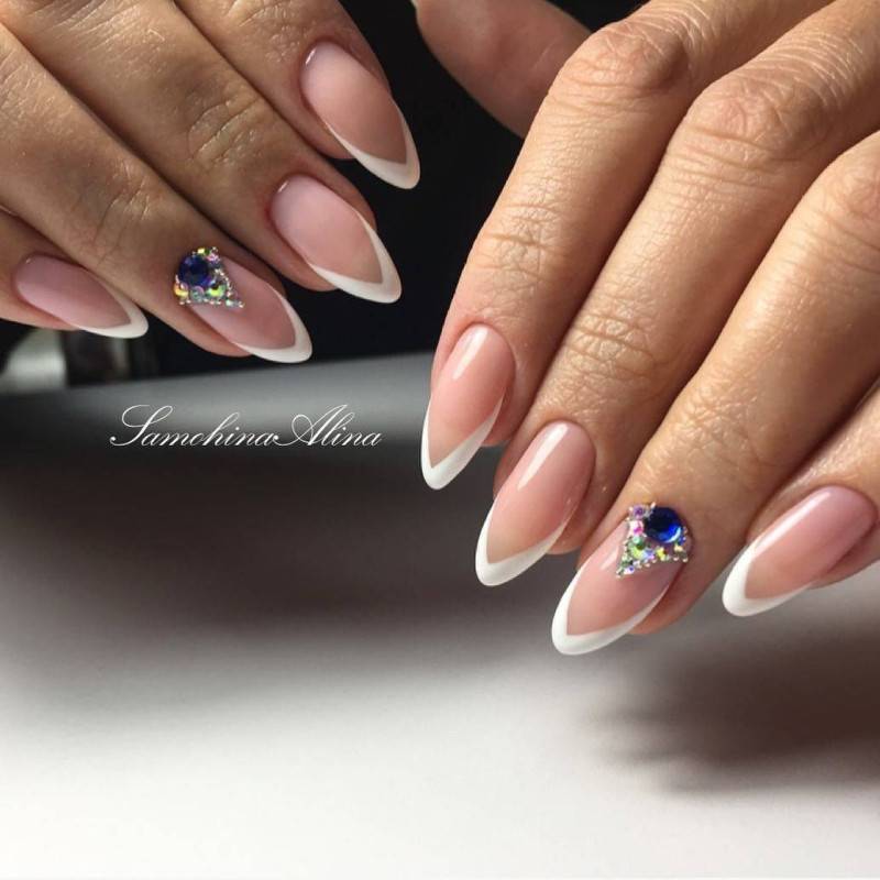Форма миндаль или овал — одна из самых востребованных среди модниц. Это женственность и нежность. Для миндальной формы больше всего подходит классический вариант каемки. А вот дизайн может быть практически любым.