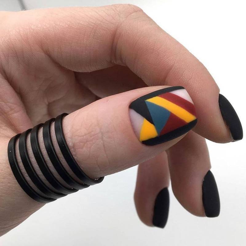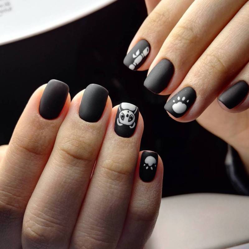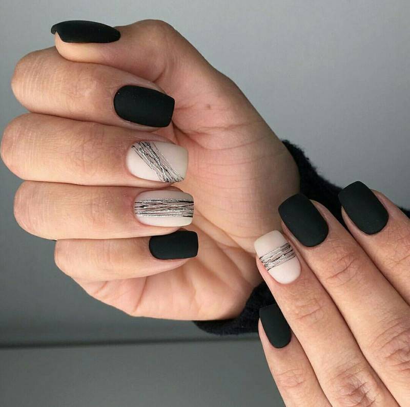Чёрный маникюр с матовым эффектом придаст ноготкам изящности, утончённости. Чтобы такой маникюр смотрелся ещё красивее, его обычно дополняют глянцевым лаком чёрного цвета. Можно некоторые ноготки покрыть глянцем, а некоторые матовым лаком – выйдет очень оригинальный дизайн.