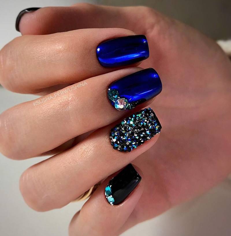 Если вы решите добавить в черный маникюр оттенок из синей палитры, выбирайте светлые тона. Иначе ваш дизайн будет слишком мрачным