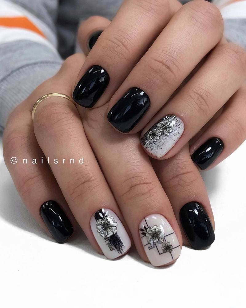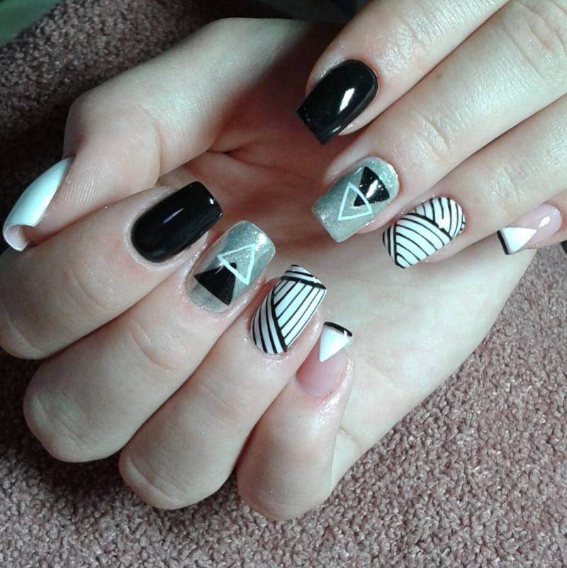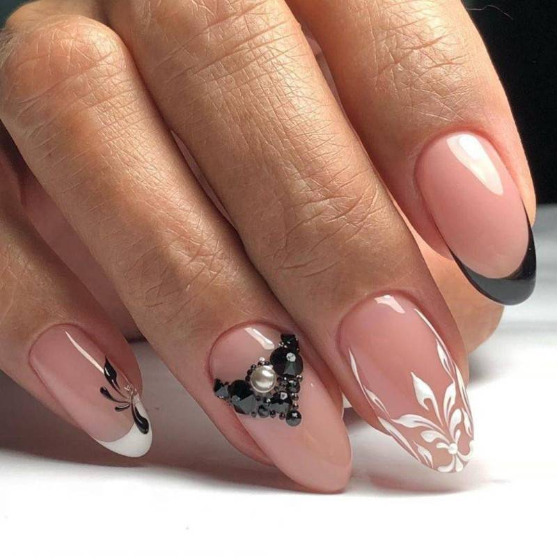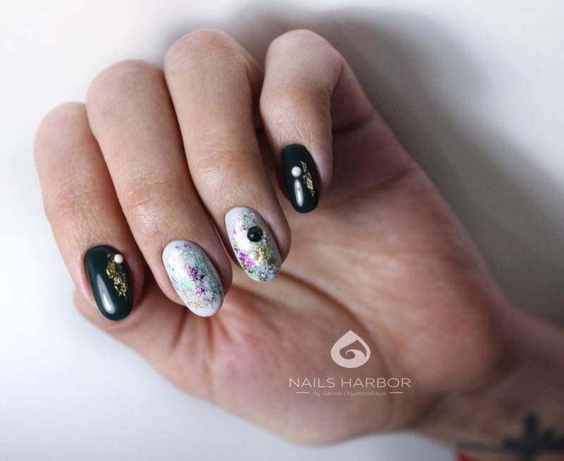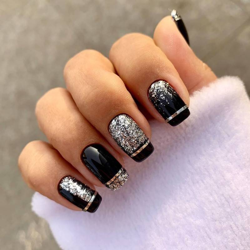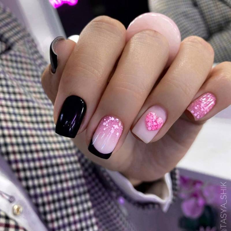 Когда речь идет о сочетаниях черного и других цветов в маникюре, то первой возникает ассоциация с очень эффектным и беспроигрышным сочетанием черного и белого. Игра контрастов дает несметное количество разнообразнейших креативных сочетаний: полоски, клеточки, горошек, геометрия, абстракция, мраморные узоры, французский и лунный маникюр, тематические принты, негативное пространство, эффектный градиент, минималистический дизайн, силуэтные рисунки, надписи черным на белом и наоборот, и многие другие. Самыми удачными и популярными в этом году также стали сочетания черного с нежным и женственным розовым и ярко-розовой и насыщенной фуксией, со всем спектром очень актуальной нюдовой палитры гель-лаков, классическим красным и его невероятными оттенками, а также мегамодным в этом году и в маникюре, и в одежде изумрудно-зеленым цветом лака и блестящих украшений, напоминающими драгоценный натуральный камень изумруд!