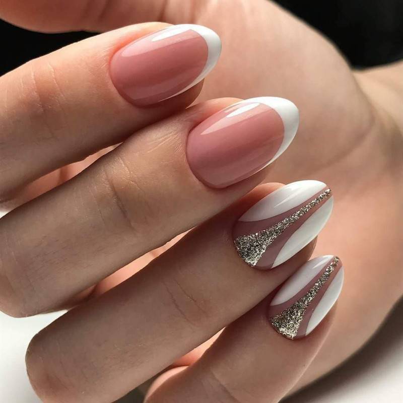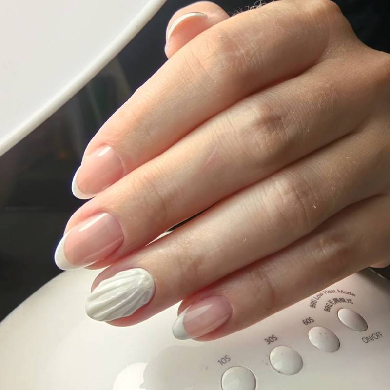 Актуален обычный классический вариант френча с темной — глянцевой или матовой — каймой. Если хотите сделать нейл арт индивидуальным, добавьте минималистичный рисунок — полоски, абстракцию и др.